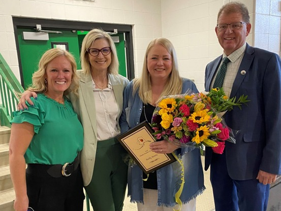 “Today’s surprise announcement came during a spirited school-wide assembly, and what makes this honor even more special is that Kelly was nominated by her very own students. As the cherished choir teacher, Kelly has inspired countless students with her passion for music and theater.
