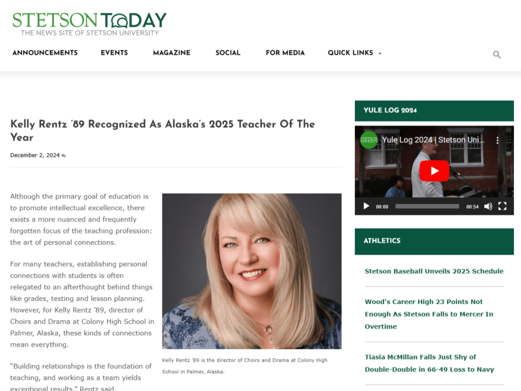 Kelly Rentz ’89 Recognized As Alaska’s 2025 Teacher of the Year – Interview with Stetson Today